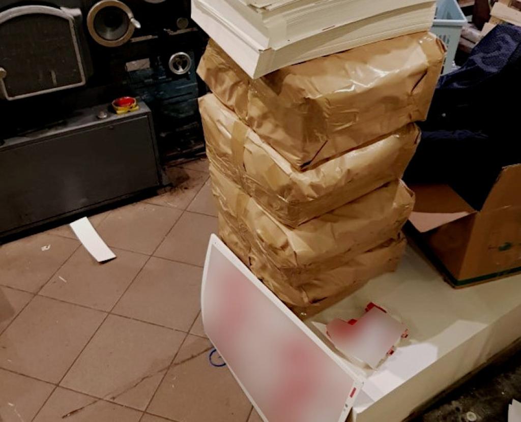 Funkcjonariusze nie dali wiary tym tłumaczeniom i po chwili znaleźli mężczyznę ukrytego w ścianie na poddaszu. Fałszerz miał tam zrobioną skrytkę, w której się schował. Podczas przeszukania posesji ujawniono 20 tysięcy fałszywych opakowań papierosów.