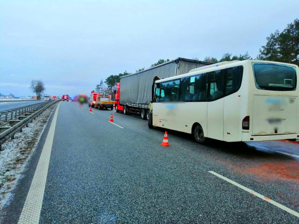 Dziś kwadrans po godzinie 6.00 rano policjanci odebrali zgłoszenie o wypadku autobusu oraz 2 samochodów ciężarowych na trasie S-8 w miejscowości Niegów. Oficer dyżurny natychmiast skierował na miejsce policjantów ruchu drogowego, którzy we wstępnej fazie akcji ratunkowej zabezpieczyli miejsce zdarzenia, wspólnie ze służbą medyczną oraz strażakami udzielali pomocy osobom poszkodowanym, a także organizowali objazdy.